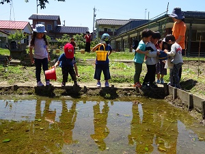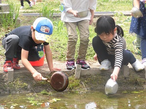 代掻きでおたまじゃくしを踏んでしまうかもしれないと、すみれ組とばら組のお友達がおたまじゃくしを捕まえて池に逃がしてあげることにしました。