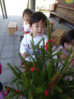 さくらんぼ組のお友達は玄関先の小さなクリスマスツリーに飾り付け。