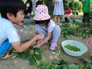 今日はばら組のお友達みんなで枝豆を収穫することにしました。畑にどんどん入っていって、茎をしっかり持って引っこ抜きます。ちょっと力が必要でしたがみんなどんどん抜いて集めました。