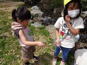 手を伸ばせば届きそうです。覗いていたお友達が木の枝を拾ってきて、花びらすくいが始まりました。