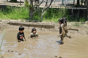 あらあら、泥の中で思いっきり走っていたら靴下が脱げてしまったようです。脱げてなくなった靴下をみんなで探しました。泥の中の宝探し。 |