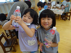 醤油さしで作った浮沈子も入っているので、ペットボトルを押すとお魚が沈み、手を緩めるとお魚が浮かびます。面白いね。 |