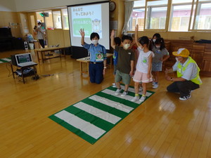 幼稚園にお家の方がお迎えに来て一緒に帰る時には、大きな道路を渡らなくてはなりません。しっかり止まること。車が来ないか確認するために、右を見て、左を見て、もう一度右を見て手を上げて渡ることをお約束しました。