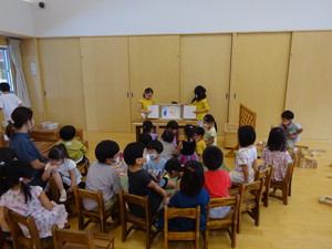 夏休みの預りの時にお絵かきをしていて思いついた紙芝居づくり。初めは絵を描くことを楽しんでいましたが、本格的に紙芝居を作るということになり、気が付いたことがたくさんありました。