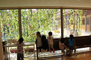 毎年、暑い夏の日差しをよしずを使ってよけていましたが、今年は朝顔が大きく育ちいい日よけになっています。