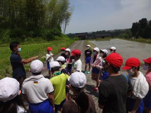 5年生の総合学習では、日本の主食であるお米や稲作について学習しています。蓮花町の山下さんには、毎年お世話になっています。カエルやアメンボが益虫として田んぼで立派な役割を果たしていること、山からの水、そして人がつくった水路や用水があってこそ棚田に水がいきわたることなど、たくさん教えていただきました。何気ないくらしの中に、コメ作りへの農家の思いや自然の営みをいかす知恵などがたくさんあることを考えさせられました。