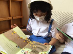 各自、好きな絵本を読んでよい時間になると、子どもたちは、嬉しそうに「どの本を読もうかなあ~」と悩みながら、絵本を選び、集中して読んでいました。
