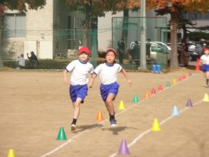 スタートの笛の合図で、子どもたちは、元気いっぱいに走り出しました。呼吸が苦しかったり、足が重くなったりする中、子どもたちは、1秒でも速く走るために、最後まで力を振り絞っていました。