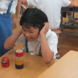 今回、体験したむかしあそびは、「あやとり、だるまおとし、紙風船、たけとんぼ、けん玉、こままわし、糸電話、お手玉、ふくわらい、ゴム跳び」です。
