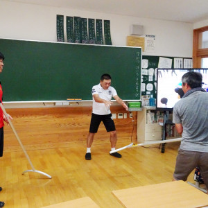 全職員が校内に不審者を発見した時にどう動き、声をかけ、そしてどう児童を避難させるかを身に付けるためには、実際に動いてやってみることが肝心です。研修後の振り返りでは「大きな声を出すのは緊張した」「他の教職員の応援を頼むタイミングが難しい」「さすまただけでなく、身近にある長机で移動を阻止するのは有効だった」などの実感を伴った話ができました。