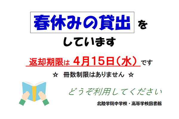春休み前に借りた本の返却期限は4月14日(月)です。 - 2025年2月26日
