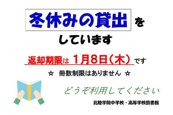 冬休みに向けて、ぜひ図書館の本を利用してください。返却期限【1月12日(木)】