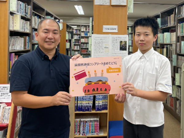 中学2年生の中村颯汰くんが本校の図書館通帳を1冊コンプリートしました。