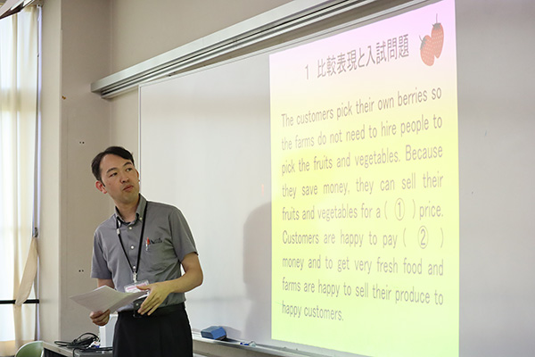 スクリーンに流れてくる英文を、素早く読み上げるという難しいスピーキング練習でしたが、先輩のお手本を見ながら、ゲーム感覚で楽しく英語を学びました。