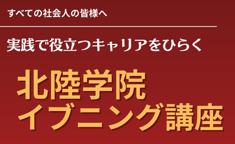 学校法人北陸学院では、「人生にもういちど学校を」という想いのもと、社会人の皆さまを対象とした 「北陸学院イブニング講座」 を開講いたします。