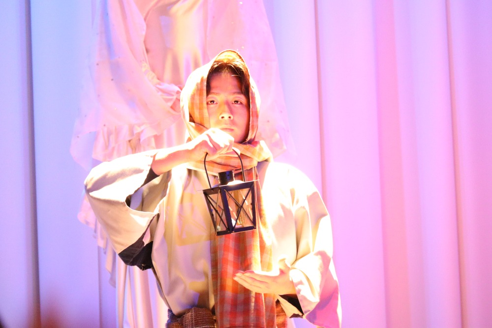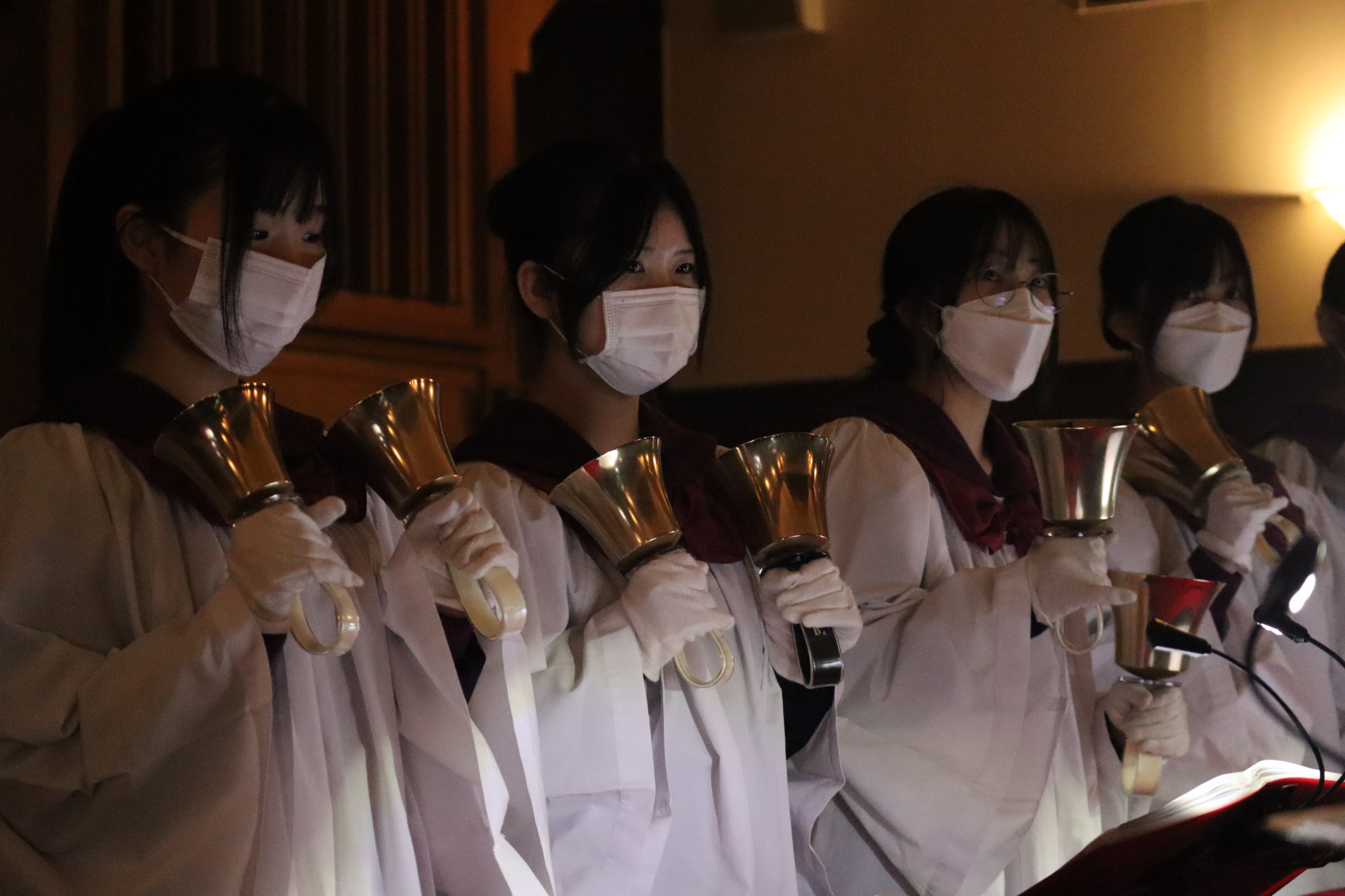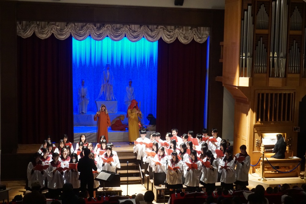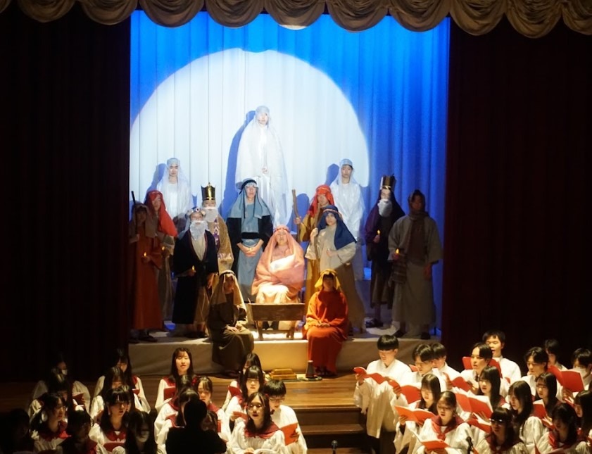 舞台では、静寂の中に響くパイプオルガンやハンドベルの音色、そして聖歌隊の歌声と共に、物語が紡がれました。小さな灯りが暗闇を照らす中、この世界の暗闇に到来した「救いの光」、御子イエス・キリスト。その誕生という出来事を、生徒たちは一つひとつの所作に祈りを込めて表現しました。