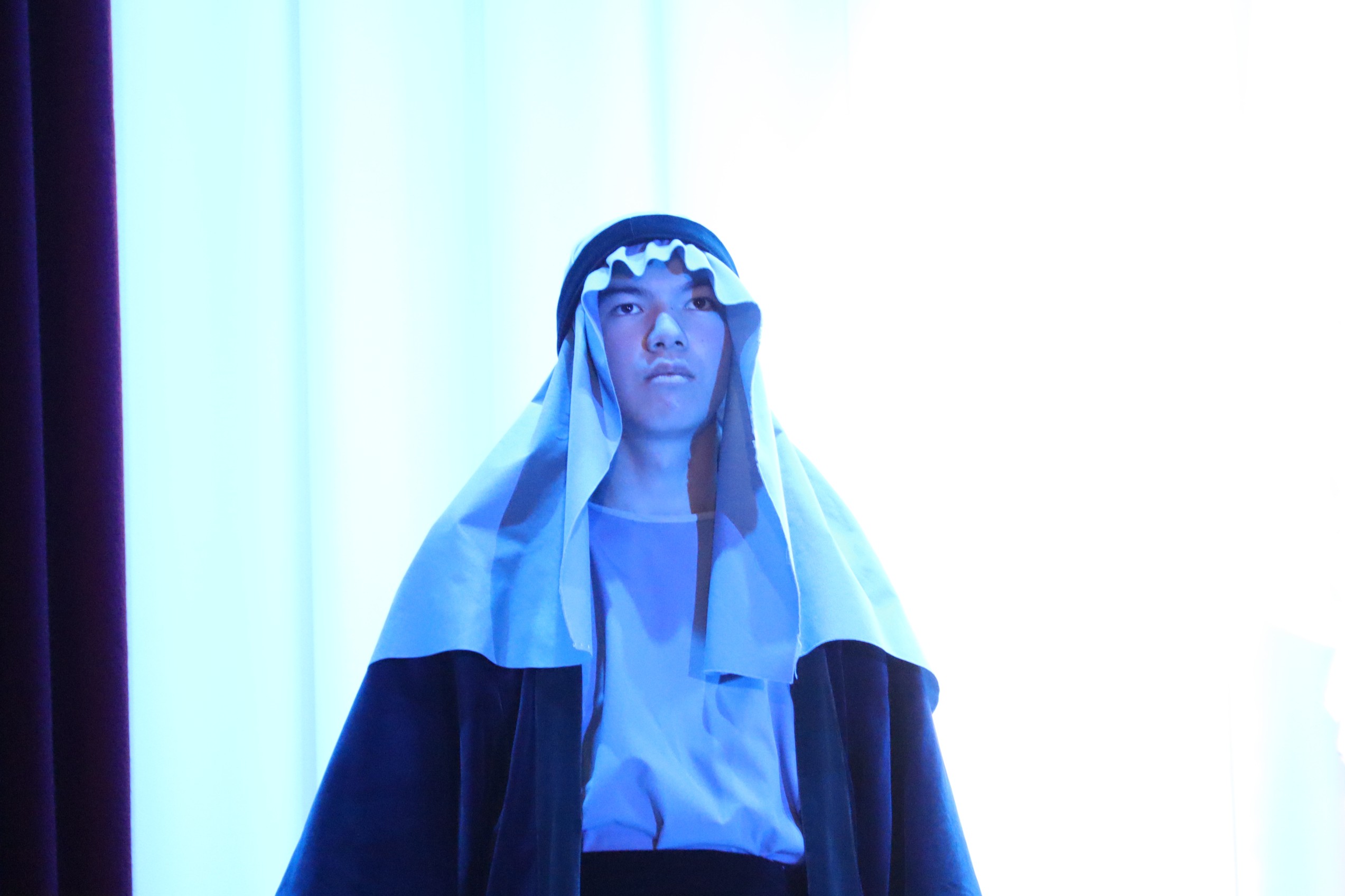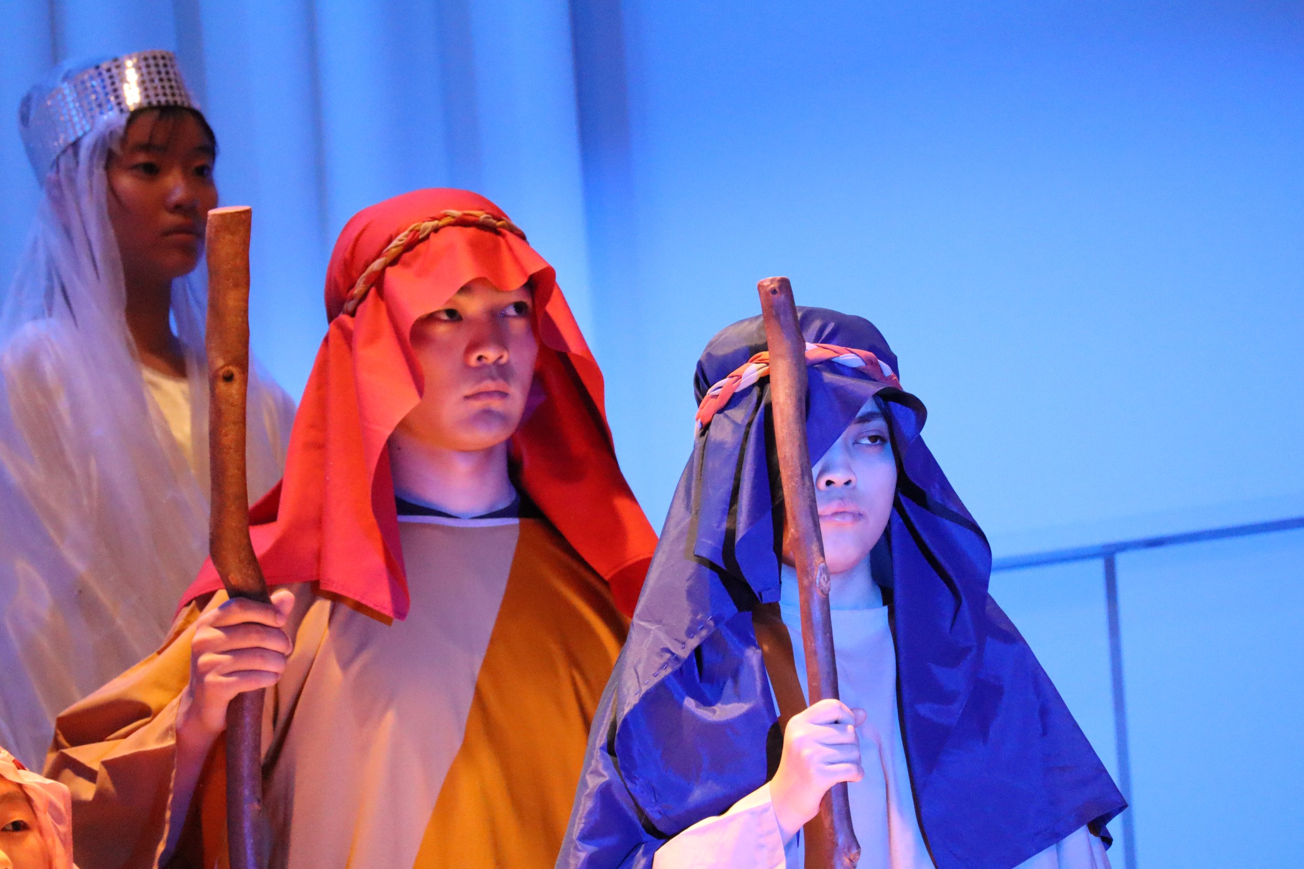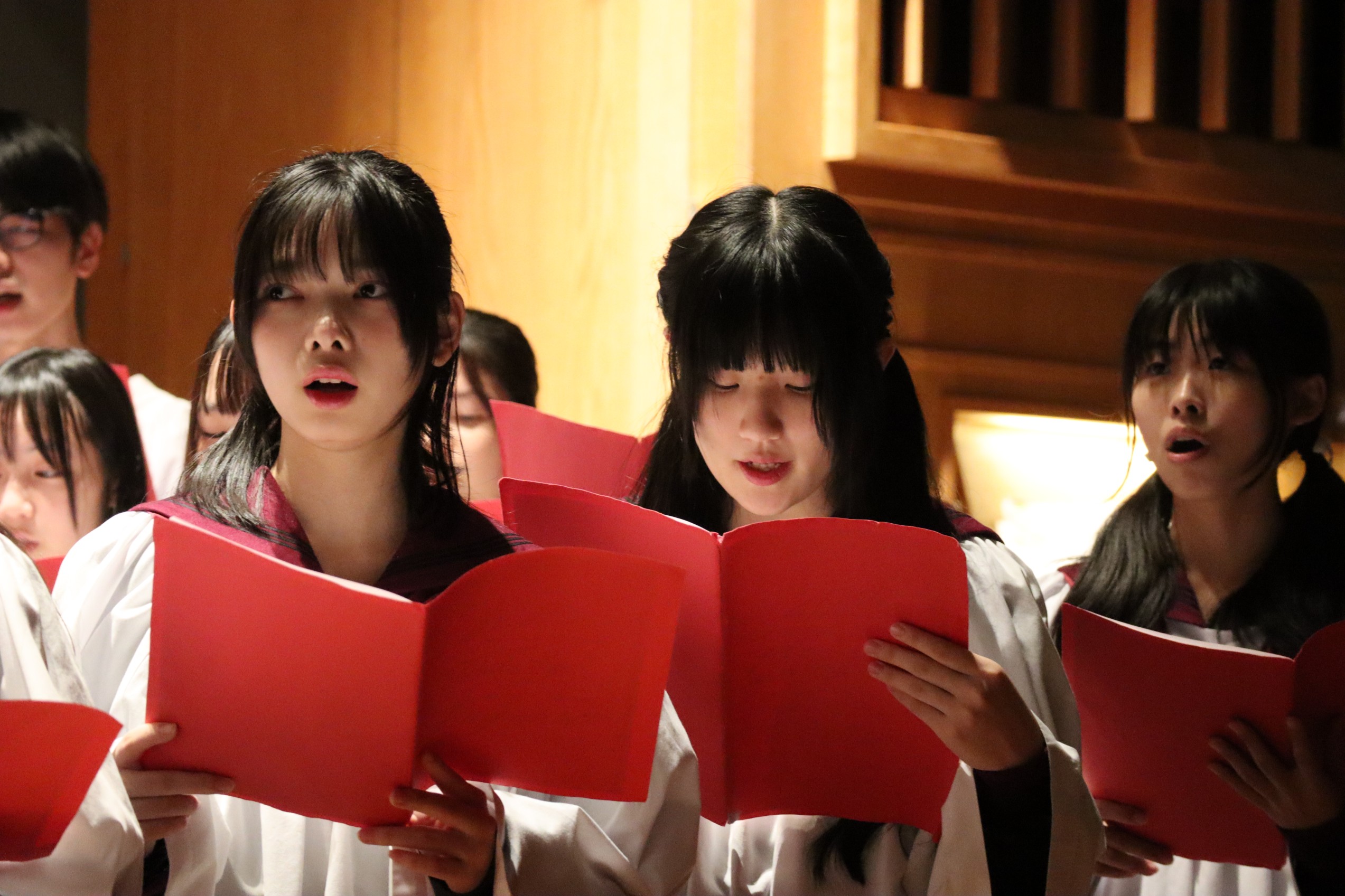 舞台では、静寂の中に響くパイプオルガンやハンドベルの音色、そして聖歌隊の歌声と共に、物語が紡がれました。小さな灯りが暗闇を照らす中、この世界の暗闇に到来した「救いの光」、御子イエス・キリスト。その誕生という出来事を、生徒たちは一つひとつの所作に祈りを込めて表現しました。