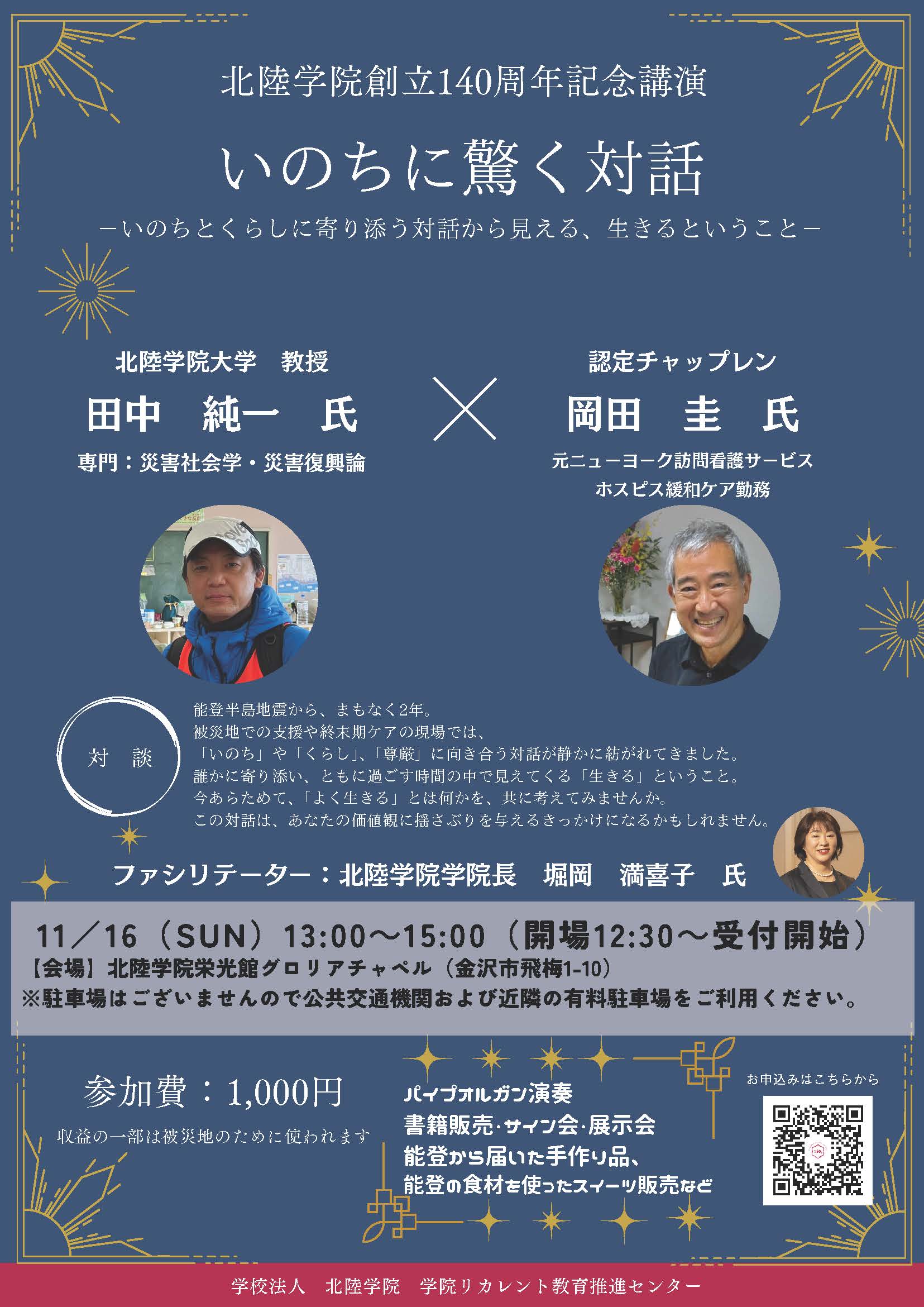 登壇者には、ニューヨークでホスピス・緩和ケアの分野でご活躍された認定チャップレン 岡田 圭 氏(北陸学院小学校卒業生) と、数多くの自然災害被災地での調査・研究・復興支援に携わる本学教授 田中 純一 氏 をお迎えします。