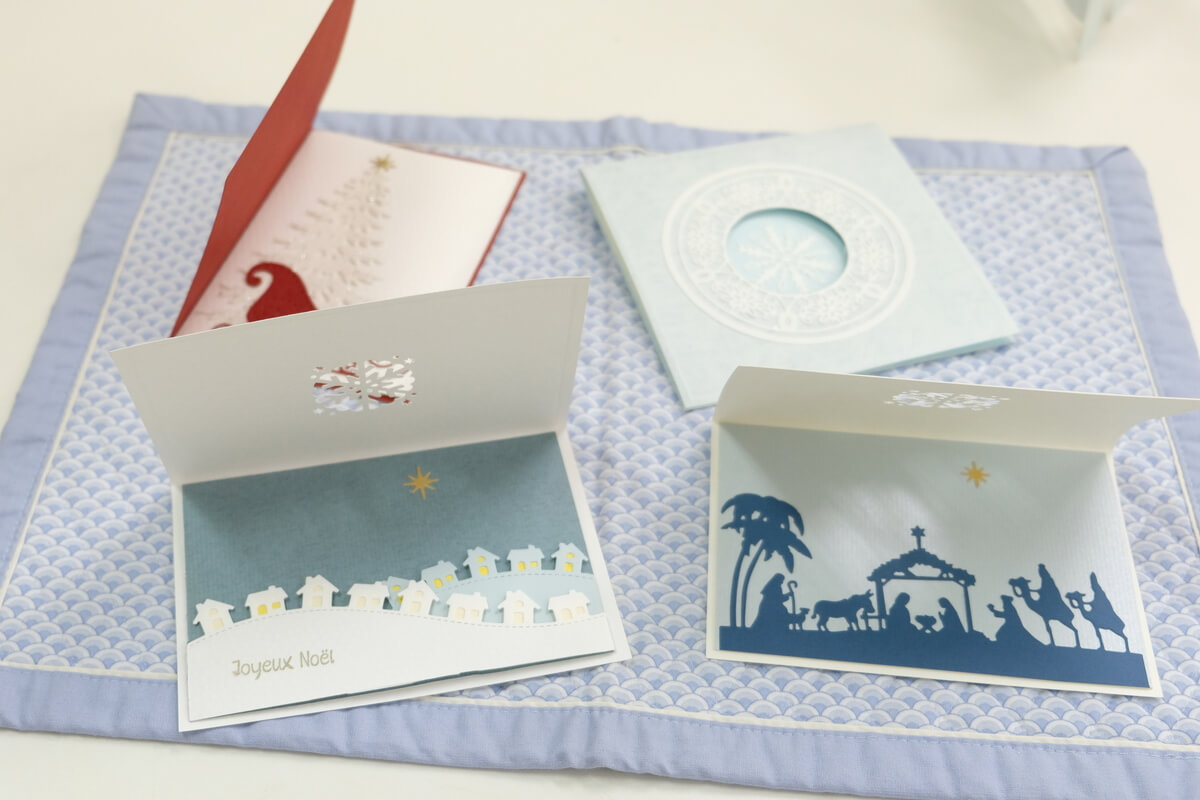 今回は瀬戸美江先生が講師となり、参加された皆さんにカードの材料を配布し、それぞれが厚手のカードに型押しやエンボス加工を加えたり、型抜きされた素敵な鳩やノエルの文字を配置しながら思い思いのクリスマスカードを作りました。