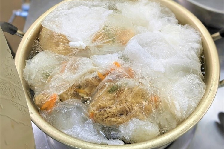 ポリ袋に材料と少量の水を入れ、空気を抜き(水をはったボールの中でするときれいに抜けます)ポリ袋をグルグルねじって結び、水をいれた鍋にいれ沸騰させ、(料理に合わせて沸騰させる時間や蒸らし時間、取り出し時間が異なります)それぞれ出来上がったら、新聞紙で作った食器(クッキングペーパーやポリ袋も使用)に盛り付けました。