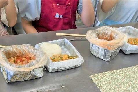 教えていただいたのは、ポリ袋を使った一人分の料理と、新聞紙でつくる食器です。
