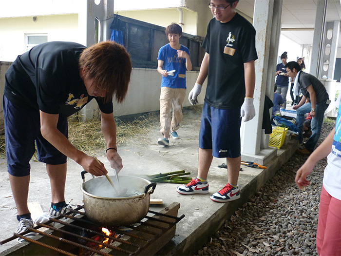 おっちゃん先生と野外活動の2回目。今回は前回竹で作成した器で飯盒や天ぷらなどを食べました。