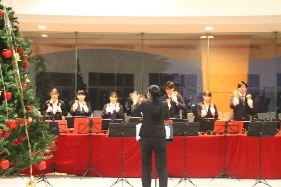 11/26(水)に、フレンドシップホールにある大きなクリスマスツリーの点灯式を行いました。北陸学院大学ハンドベルクワイアの優しいハンドベルの音色でみなさまをお出迎えし、北陸学院の源流となった金沢女学院開校式で鳴らされた『開校の鐘』を鳴らし、学生宗教委員による聖書朗読、矢澤学長によるお祈りの後、ツリーが点灯されました。
