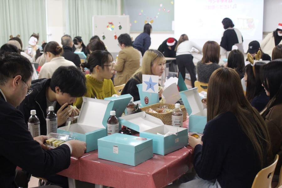 礼拝後には、学部ごとにお祝いの会を開催し、食事を共にしながら、ゲームやクイズなどを通して親睦を深めました。学生・教職員が共に和やかなひとときを過ごし、豊かな交わりの時間となりました。