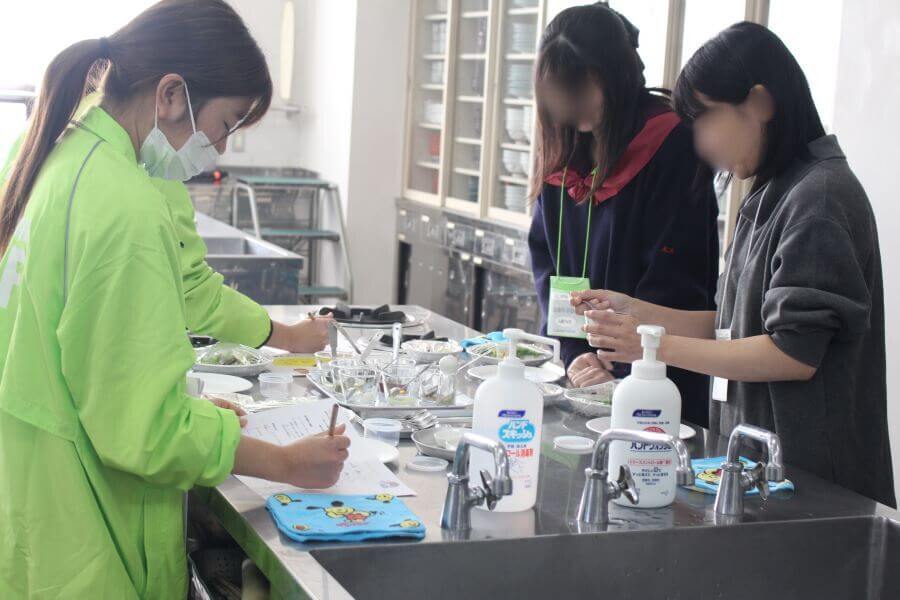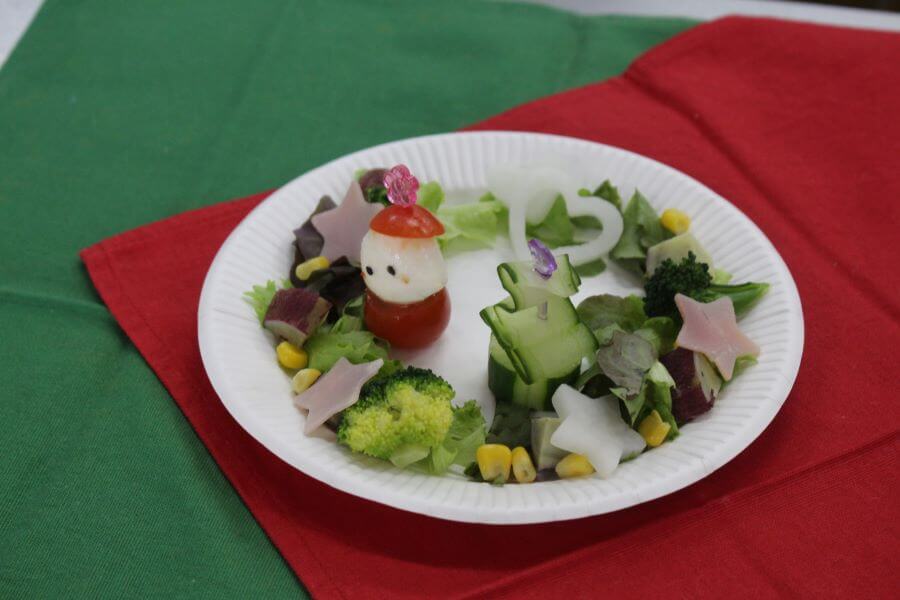 また、健康科学部を希望される方には、オリジナルドレッシング作りの実習を実施し、完成したドレッシングを クリスマスリースサラダ にかけて試食していただきました。