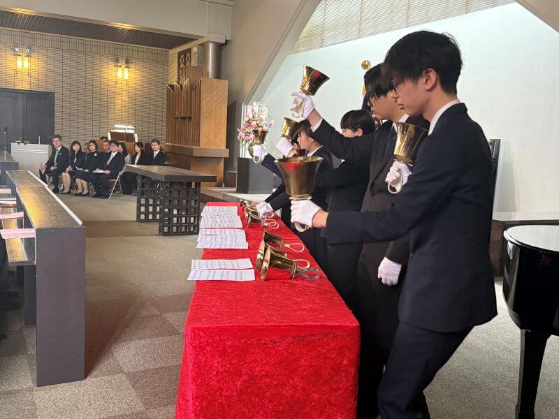 礼拝はオルガンの前奏に始まり、学院長による聖書の招きの言葉(マタイによる福音書第7章7–8節)が朗読され、新入生をあたたかく迎えるひとときとなりました。讃美歌「主の招く声が」を一同で讃美し、大学ハンドベルクワイアによる「Amazing Grace」の響きが礼拝堂にやさしく広がりました。祈祷、入学許可宣言、新入生宣誓などが厳かに行われ、入学の節目にふさわしい時間となりました。