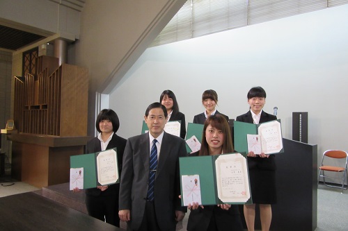 学長賞とは、本学の学生として勉学はもとより様々な活動に意欲的に取り組み、人物ともに優れた成果を収めた方に授与されるものです。今回は卒業年次以外の学年が対象となっているため、幼児児童教育学科3名、社会学科3名、食物栄養学科1名、コミュニティ文化学科1名の8名が表彰されました。なお、卒業年次の大学4年生・短大2年生は、2017年3月に行われる卒業証書・学位記授与式にて授与される予定です。
